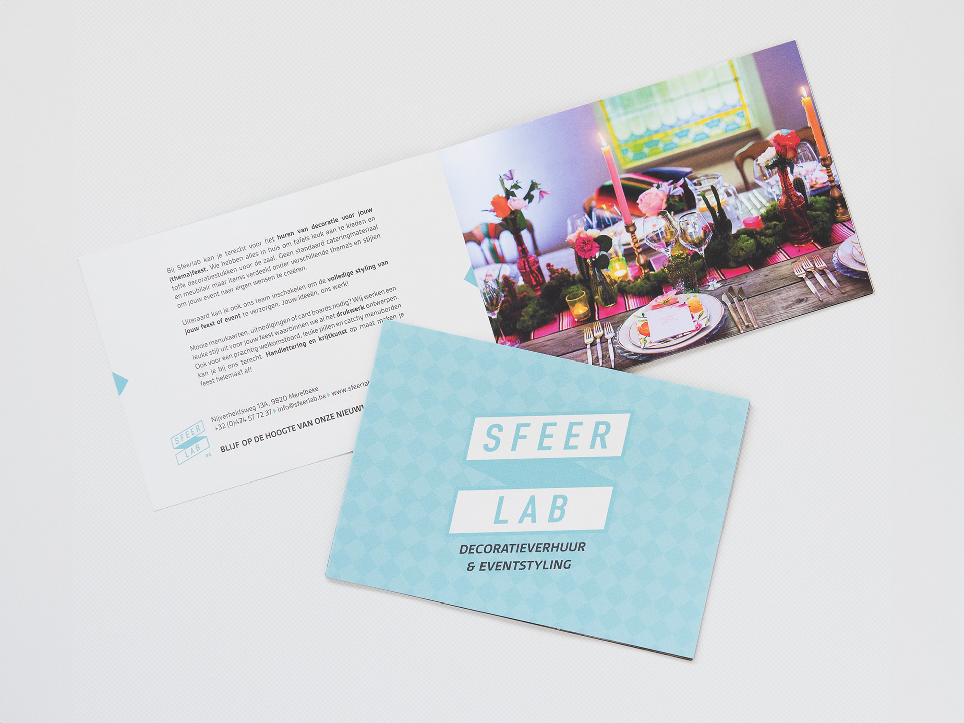 Op basis van de bestaande huisstijl, ontwierp ik deze brochure voor Sfeerlab, gespecialiseerd in decoratieverhuur en eventstyling. Het vierluik in liggend formaat zorgt voor een leuke, speelse benadering.